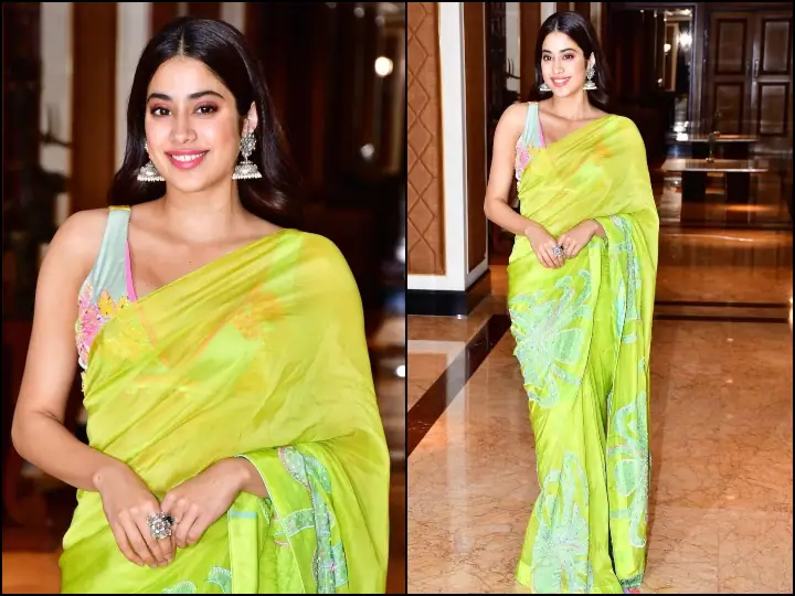 इस साड़ी के साथ जान्हवी ने ब्लू कलर का स्लीवलेस ब्लाउज पहना था, बड़े झुमके और खुले बालों के साथ एक्ट्रेस ने इस लुक को और ग्रेसफुल बना दिया था.