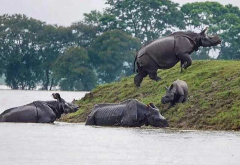 In a recent incident, a Rhino who strayed out of the park in the highway has moved back now into the park. Such cases of displacement have been common ever since the onset of floods.