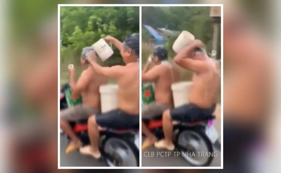 Two men have been fined by police after they were filmed showering while riding a motorbike in southern Vietnam, local reports say.