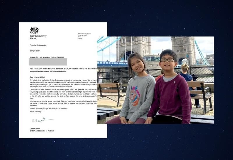 Two kids in Hanoi recently gifted 20K medical masks to 🇬🇧, using the “lucky money" that they've saved up for a few years. These masks have been sent to 🇬🇧 successfully on our special commercial flight last week. Many thanks Nhan & Khoi! You can read Amb. @GarethWardUK's letter 👇 pic.twitter.com/02s3VIZ4lv