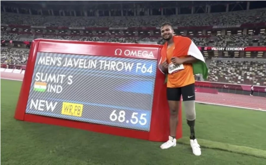 Sports Desk: Indian para javelin thrower Sumit Antil on Monday clinched India's second gold in Tokyo Paralympics by winning the men's javelin F64 event with a world record throw of 68.55 metres.