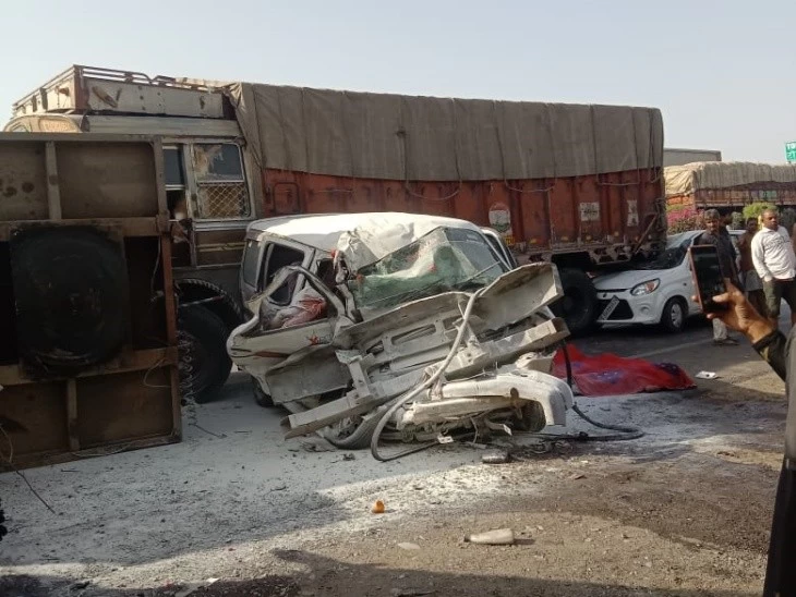 Sirohi: In a horrific road accident on Sunday morning, 6 people, including a three-month-old girl, died tragically. A trolley coming from the wrong side first collided with a truck and then two cars entered the truck. Due to the high speed, the first car that collided with the truck got blown up. At the same time, the car behind him was also badly damaged.