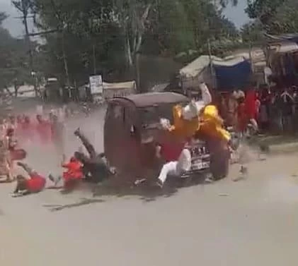 Two policemen were suspended after a speeding car allegedly ploughed into a Durga Pooja procession in the Jashpur district on Friday, killing a person and leaving 17 more injured.