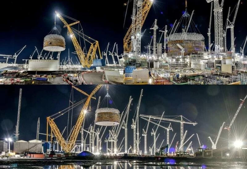 London: The world's largest crane completed its biggest ever lift today, hoisting a 575 ton steel cylinder into place at Hinkley Point.