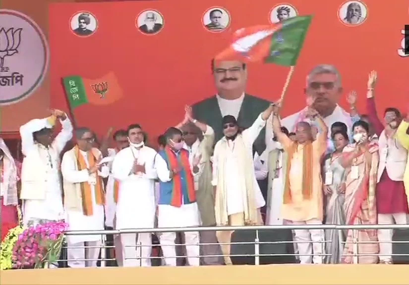 BJP general secretary Kailash Vijayvargiya, party vice president Mukul Roy, and Suvendu Adhikari were also present at the ground where Prime Minister Narendra Modi is scheduled to address an election rally later today.