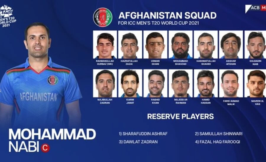 Afghanistan squad for T20 World Cup 2021: Mohammad Nabi (captain), Rahmanullah Gurbaz (wk), Hazratullah Zazai, Usman Ghani, Mohammad Shahzad (wk), Hashmatullah Shahidi, Asghar Afghan, Gulbadin Naib, Najibullah Zadran, Karim Janat, Rashid Khan, Mujeeb ur Rehman, Hamid Hassan, Farid Ahmed, Naveen ul Haq.