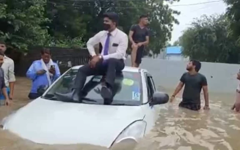 A cab got stuck in water due to waterlogging on the service road near Narsinghpur in Gurugram on Saturday. The cab got stuck there after getting filled with water for about three feet and the cab started floating like a boat in the water. During this, the passenger sitting inside the cab sat on the roof of the cab for a long time.