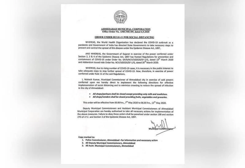 Super spreaders like those working in shops like vegetables, fruits, grocery, provisions, siper markets, and ice-cream parlours and people engaged in home delivery of these items as well as Swiggy, Zomato, Dominos etc. become a potent source of infection for many, the authorities said. "Therefore, in the entire AMC area, all shops and home delivery services except milk and medicine shall remain closed for next 7 days starting from May 7, 6 AM."