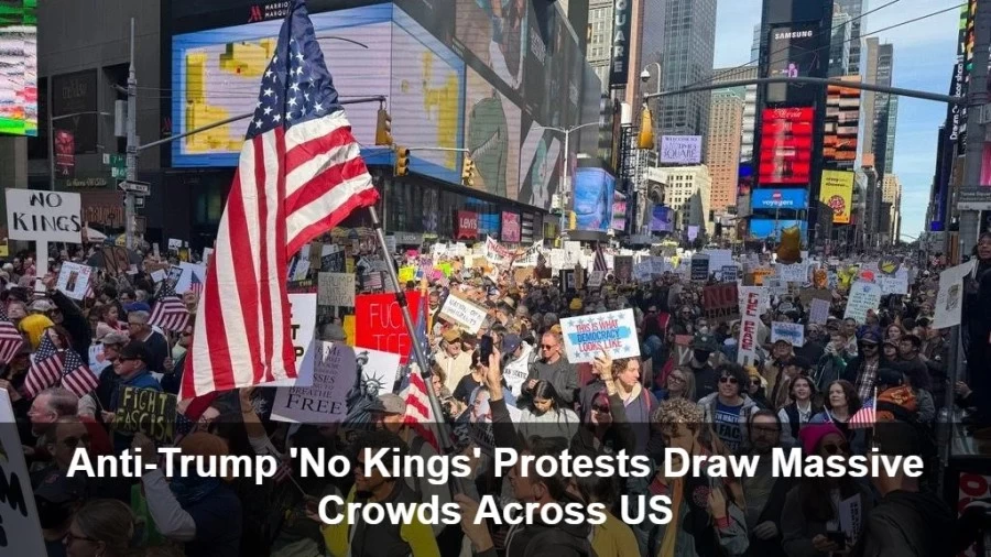 Huge crowds gathered in cities across the United States on Saturday to protest against. President Donald Trump's policies, with "No Kings" rallies sweeping through New York, Washington D. C. , Chicago, Miami, and Los Angeles. The iconic Times Square in New York City saw thousands of people converge, densely packing streets and subway entrances. Protesters held signs bearing powerful slogans such as "Democracy not Monarchy" and. "The Constitution isn't optional," reflecting deep concerns over the current administration.