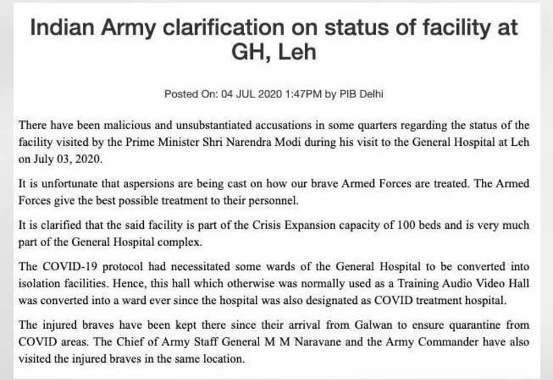 New Delhi: There have been malicious and unsubstantiated accusations in some quarters regarding the status of the facility visited by the Prime Minister Shri Narendra Modi during his visit to the General Hospital at Leh on July 03, 2020.