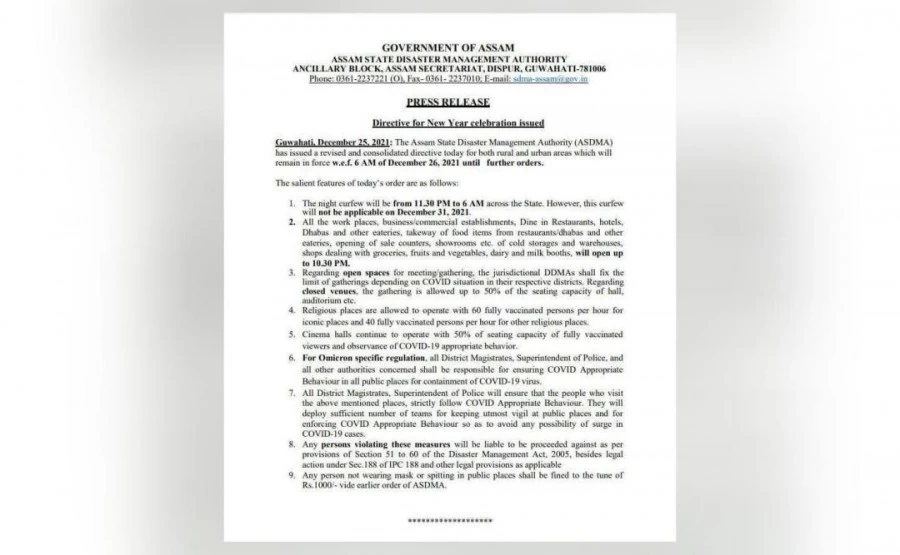 As per the state government's circular, "Night curfew to be in force from 11.30 PM to 6 AM, Sunday onwards across Assam. This curfew, however, will not be applicable on December 31, 2021."