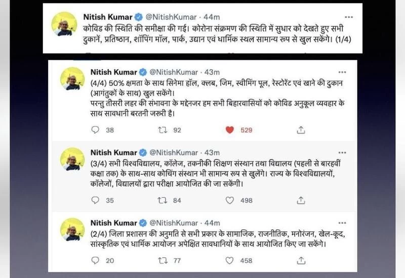 Bihar CM Nitish Kumar in a series of Tweets said, "The status of COVID-19 was reviewed. In view of the improvement in the situation of corona infection, all shops, establishments, shopping malls, parks, gardens and religious places will be able to open normally."