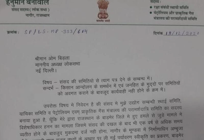 Jaipur: Having earlier expressed his opposition to the new farm laws, Rashtriya Loktantrik Party (RLP) chief and Nagaur MP Hanuman Beniwal, whose party is an NDA member, Saturday announced his resignation from three Lok Sabha committees and said he will march towards Delhi on December 26 with two lakh supporters, in protest against the three Acts.