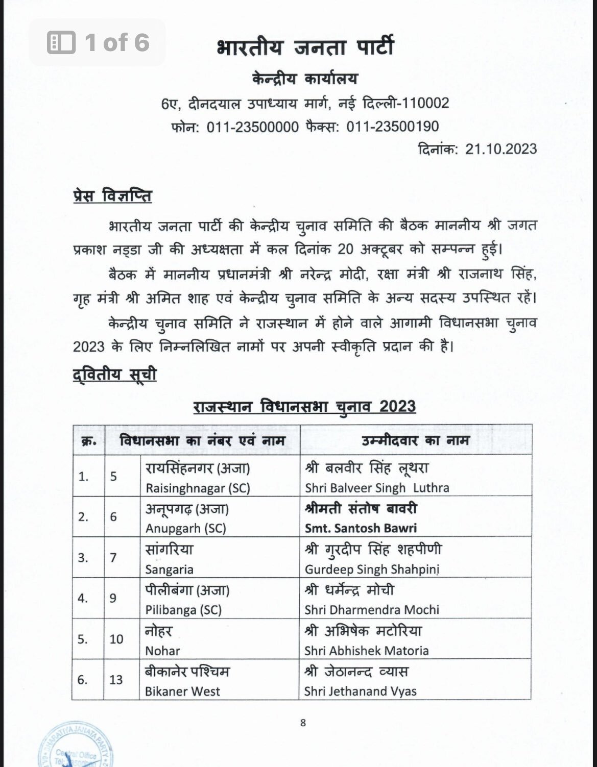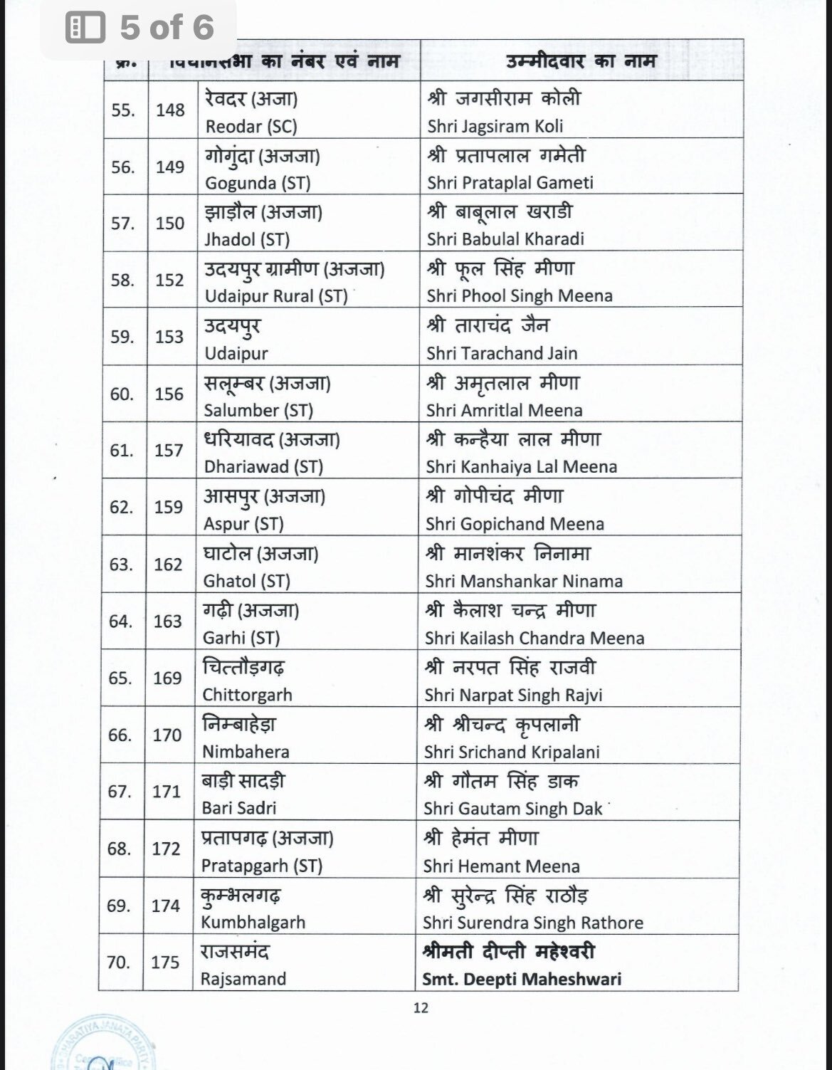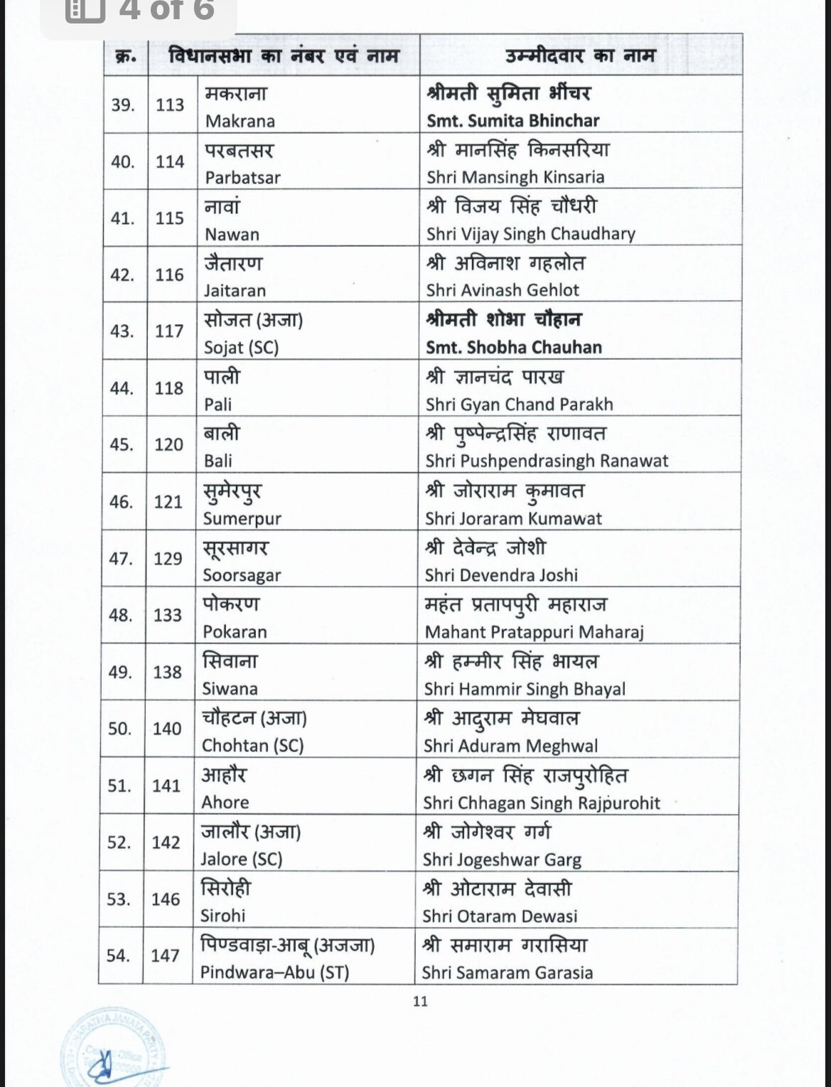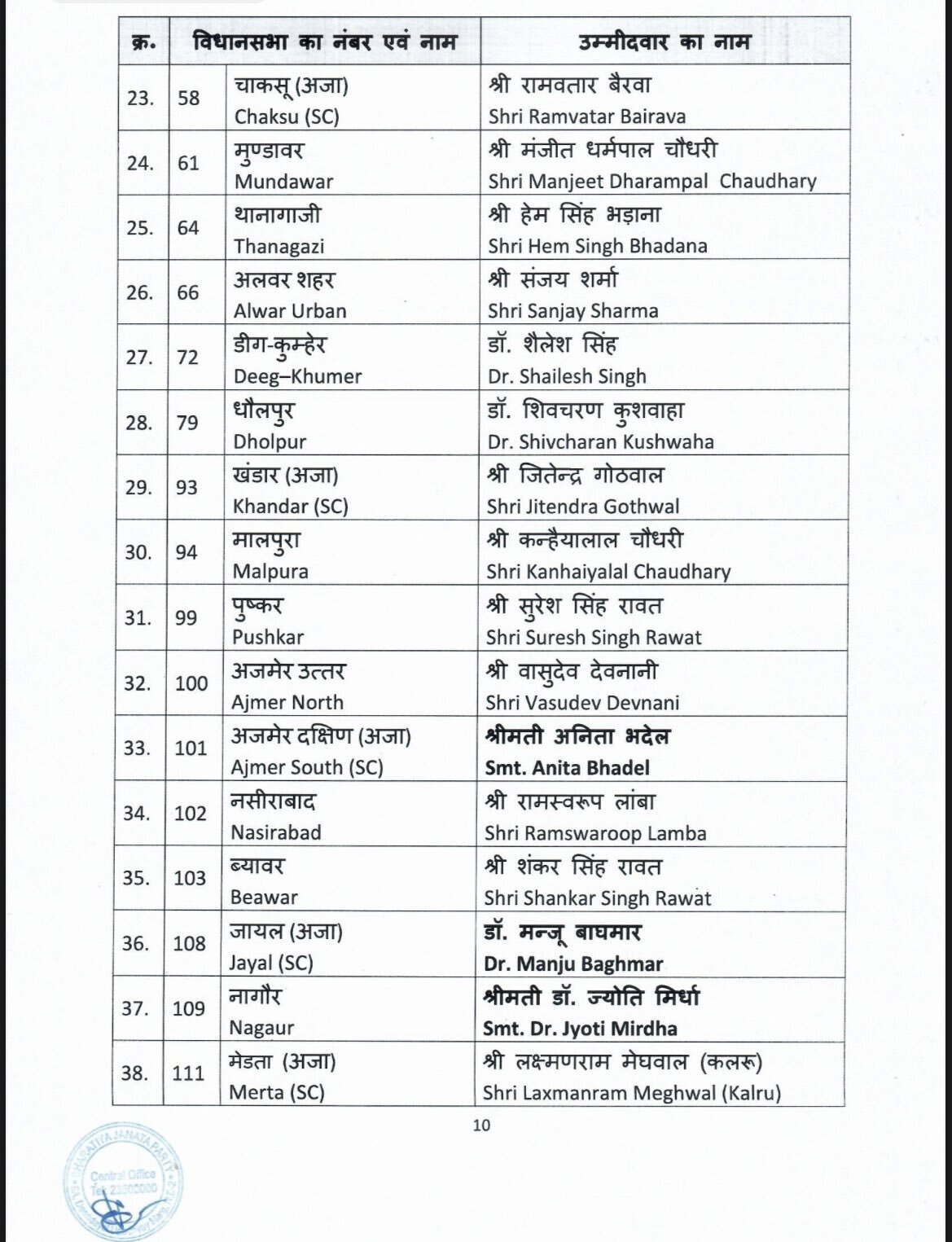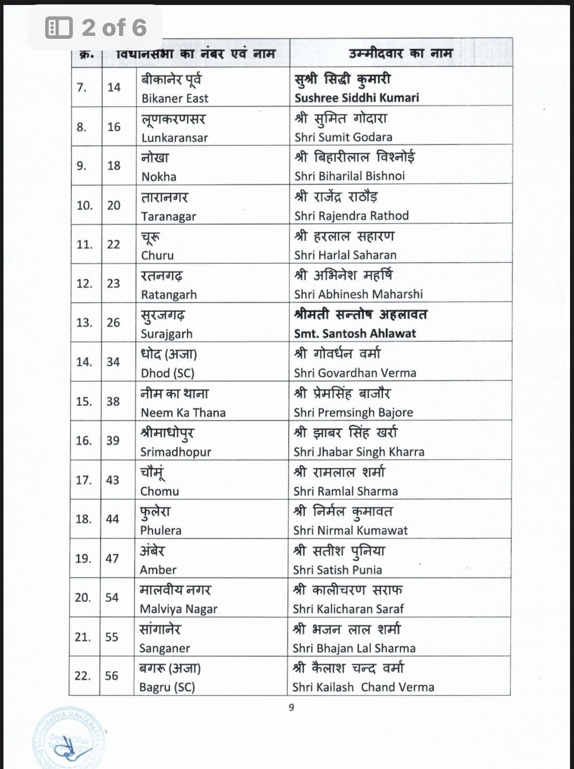 Vidyadhar Nagar MLA Rajvi gets ticket from ChittorgarhNarpat Singh Rajvi, MLA from Vidyadhar Nagar seat of Jaipur, has now been given ticket from Chittorgarh. In the first list, BJP canceled her ticket and gave ticket to Rajsamand MP Diya Kumari from Vidyadhar Nagar.Tickets to many former ministersBJP has also given tickets to many former ministers. These include many former ministers including Pratap Singh Singhvi, Srichand Kripalani, Narpat Singh Rajvi, Otram Dewasi, Pushpendra Singh Ranaut, Anita Bhadel, Vasudev Devnani, Kaicharan Saraf, Rajendra Rathore.BJP had earlier announced candidates for 41 assembly seats on October 9. There are many surprising names in this list.Let us tell you that Diya Kumari was given the ticket in place of Narpat Singh. After which Narpat Singh's supporters were protesting. Now it is being considered an attempt to control damage by giving him ticket from another seat. Along with this, BJP has given a chance to Satish Punia from Sanganer and Bhajanlal Sharma from Amber in the second list. Jyoti Mirdha, who recently left the Congress party and joined BJP, has been made the party's candidate from Nagaur.PM Narendra Modi held high level meetingYesterday, a high level meeting of the party was held under the leadership of Prime Minister Narendra Modi. Home Minister Amit Shah and Defense Minister Rajnath Singh were also present in this meeting. Party President JP Nadda was also present in the meeting. During this, candidates in Telangana, Madhya Pradesh and Rajasthan were discussed. Rest of the candidates from Telangana and Madhya Pradesh are also believed to have been finalized.