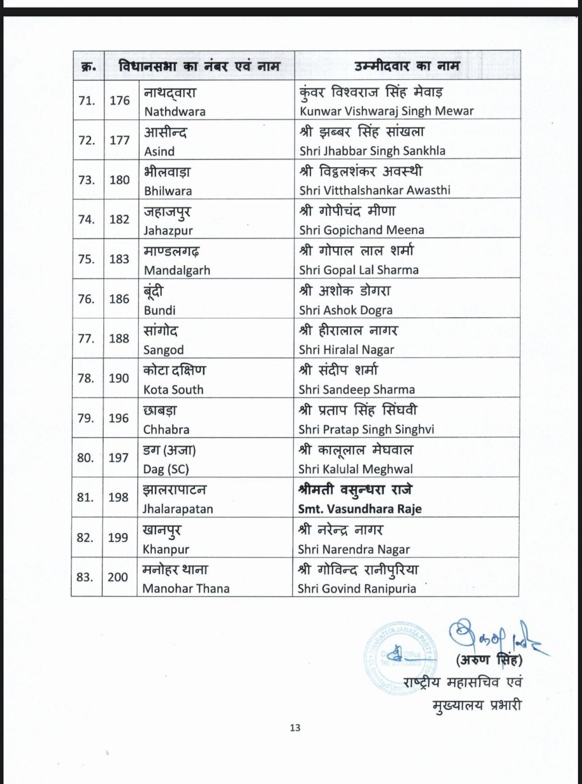 Rajasthan Election: BJP has released the second list of 83 candidates for Rajasthan Assembly elections. Vasundhara Raje will contest from Jhalrapatan, while the seat of Leader of Opposition Rajendra Rathod has been changed. He has been given ticket from Taranagar instead of Churu. He has already contested elections from Taranagar. Vishvaraj Singh Mewar, a member of the former royal family of Udaipur, has been given ticket from Nathdwara, he had joined BJP a few days ago.