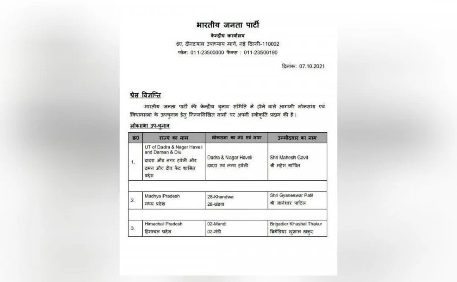 New Delhi: The Bharatiya Janata Party on Thursday released its list of candidates for bypolls to three Lok Sabha seats in UT of Dadra & Nagar Haveli, Madhya Pradesh and Himachal Pradesh and 16 Assembly seats of various states scheduld to be held on October 30.