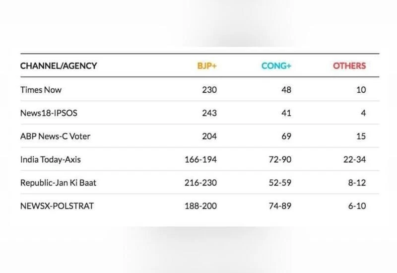 The ABP-C Voter poll gave the BJP 70 seats, the Congress eight seats, and others 12 seats in the state, while the Times Now poll gave 71 seats to the BJP, 11 to the Congress and eight to others in the state. India Today-Axis said they would release the Haryana projections on Tuesday.