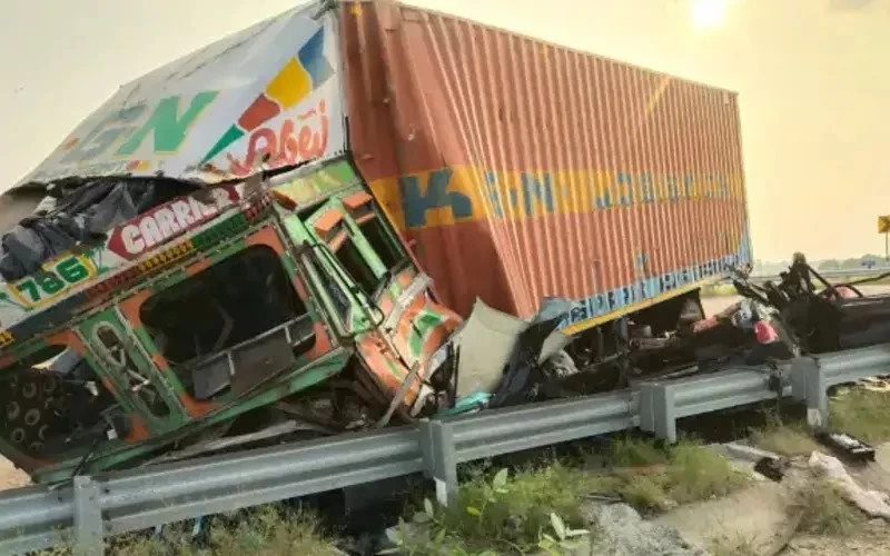It is said that the car was going from Sultanpur side and it was hit by a container coming from Lucknow side on the same road. The collision was so severe that the engine of the car and all four people fell away. One person's head was severed from the body. The car has been blown up. The identity of the dead is yet to be ascertained.