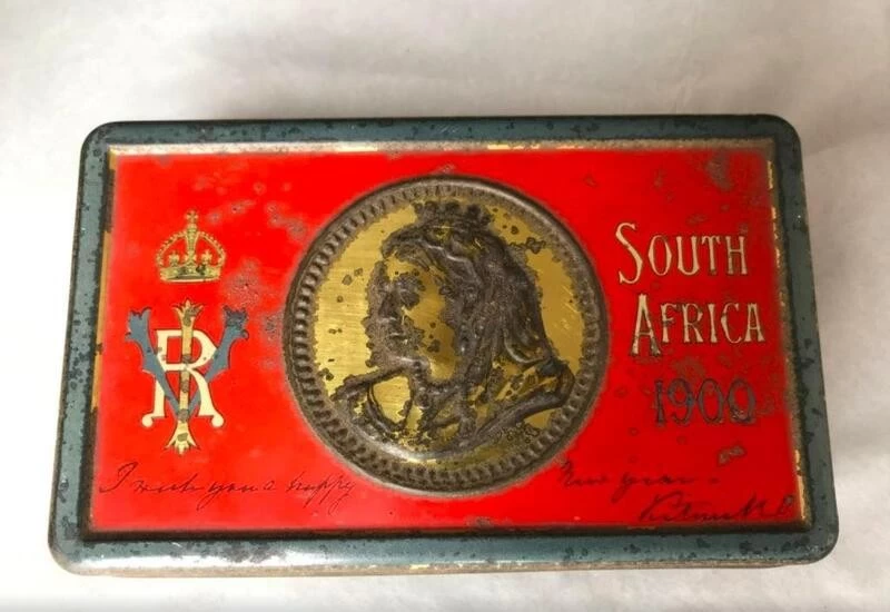 The tin lid has a message in Victoria’s handwriting that says “I wish you a happy New Year” and the inscription “South Africa 1900”, as well as a portrait of the queen.