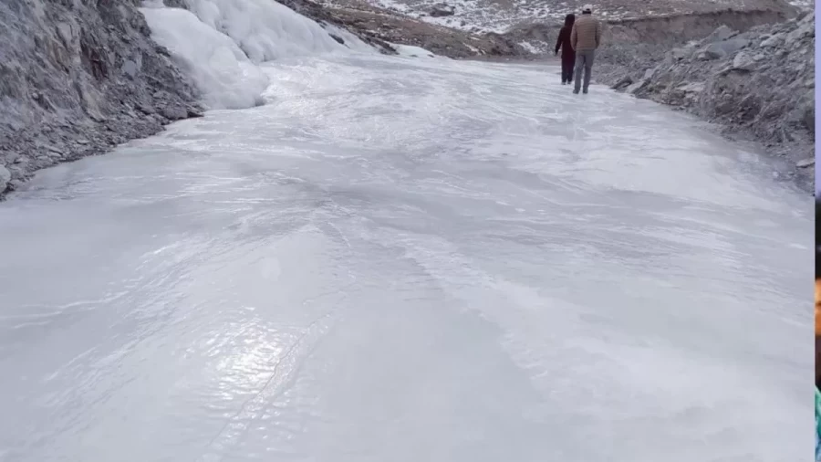 Due to freezing temperature in Himachal Pradesh, rivers and streams in Lahaul Spiti district have become heavily frozen. It seemed as if the water flowing on the roads had stopped. The temperature of the entire valley has fallen below minus 15 degrees. In such a situation, the water accumulated on the road is as hard and slippery as lead. Although this road is officially closed after 15th November, yet adventure seekers keep coming here, risking their lives.