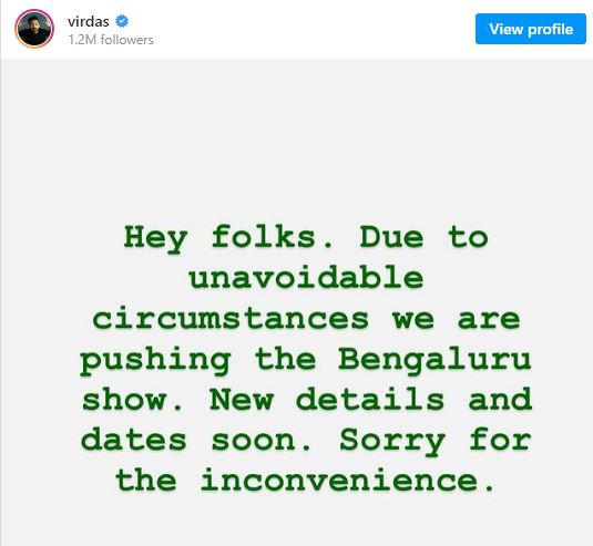 Vir Das Show: Stand-up comedian Vir Das's show in Bangalore has been postponed. Vir Das himself gave this information on Instagram. His show was to be held today, but Vir Das has shared a post on Instagram saying that due to some or the other circumstances, we are going ahead with the Bangalore show.Vir Das wrote on Instagram, “Due to unavoidable circumstances, we are taking the show Bangalore forward. New details and dates will be announced soon." He also apologized for this. In the caption accompanying this post, Vir Das wrote, "See you soon Bangalore. BMS will give you the refund. You also have the option that you can get it transferred for new dates.