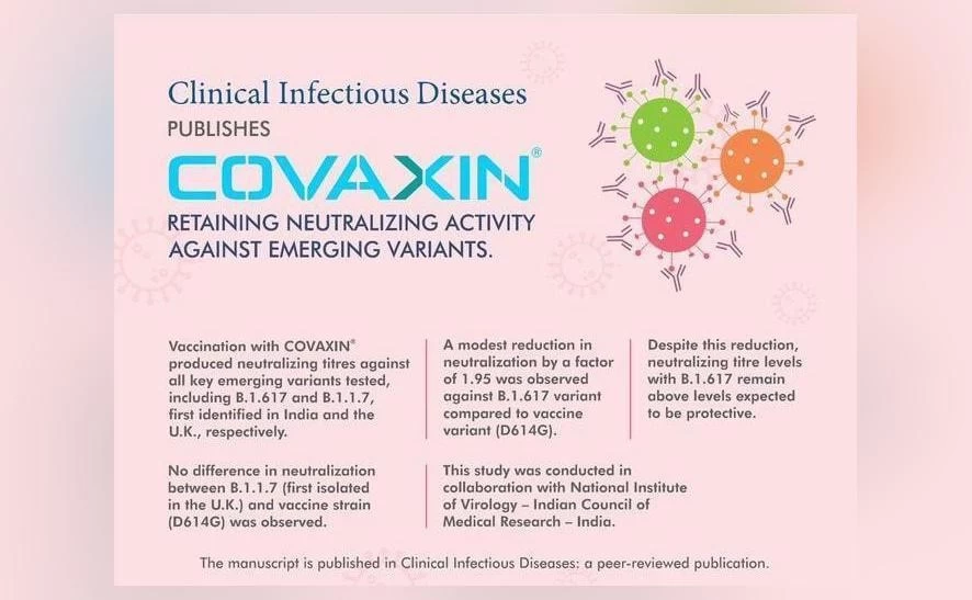 New Delhi: Vaccination with Bharat Biotech's COVID-19 vaccine - COVAXIN, has produced neutralising titres (concentration) against all key emerging variants tested, including the B.1.617 and B.1.1.7, first identified in India and the United Kingdom, the vaccine manufacturer informed on Sunday.