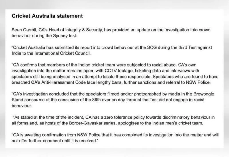 “CA confirms that members of the Indian cricket team were subjected to racial abuse,” CA integrity chief Sean Carroll said in a statement.