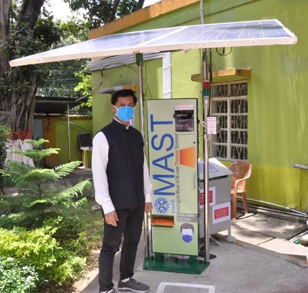 - Solar Based Intelligent Mask Automated Dispensing Unit cum Thermal Scanner (IntelliMAST)-The Solar Based IntelliMAST is an Intelligent surveillance kiosk which identifies the body temperature and whether an individual is wearing Face Mask or not through customised Software solutions. The information about an employee not wearing a Face Mask is provided to the Administration for Cashless delivery of the Mask and later deduction of the price from the Salary. In this regard the system harnesses Internet-of-Things in a seamless manner. The in-built Thermal Scanner detects probable rise in Body Temperature through forehead scanning and audio visual alert the Security Guards. The IntelliMAST will help ensure safety of supervising staff and implementation of precautionary measure in any large organization. The IntelliMAST will also facilitate Identity Card based Mask Dispensing & Attendance System. Facial Recognition based &ID Card based Attendance System will be incorporated into the system in the near future and therefore may act as a comprehensive solution for Office & Industrial Complexes as well as School & College campuses. This system uses Artificial Intelligence and Information Technology to give real-time results and can be synchronised with the Human Resource Data of any organisation for any real-time data response and dissemination of information. The IntelliMAST system is backed up by Solar Power for uninterrupted Power Supply during blackouts. The power supply requirement of the IntelliMAST is 40-50 Watts sourced through a Hybrid combination of Solar Power & Electricity.