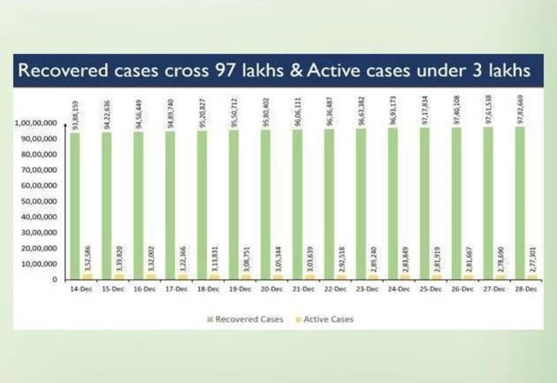 The country's active caseload stands at 2,77,301. "Share of active cases in total positive cases has further shrunk to 2.72%. A net decline of 1,389 cases from the total active caseload was registered in the last 24 hours," the Health Ministry said.