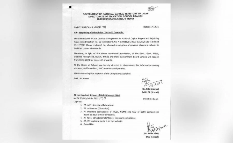 New Delhi: The Delhi government has decided to open schools for Class 6 and above from tomorrow on the directions of the central air quality commission.