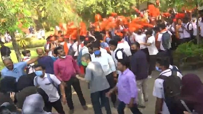 Hijab controversy is increasing in Karnataka. Today the matter is to be heard in the High Court, but before that the situation in Udupi district is deteriorating. Actually, before the hearing, the demonstration started at Mahatma Gandhi Memorial College. Students wearing saffron scarves came and started shouting slogans against the girls wearing hijab. Suddenly the matter escalated and the demonstration intensified.