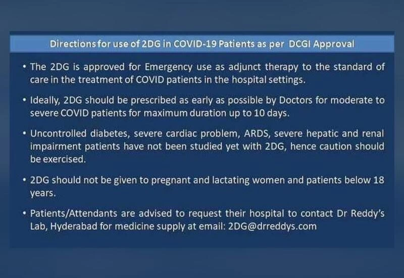 2DG should be prescribed early on by the doctors. This drug can be prescribed for up to 10 days and the recipients can be both moderate to severe COVID patients.