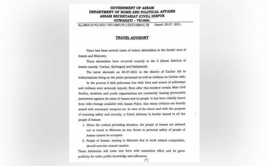 Guwahati: In wake of the heightened tensions in border areas between the two states, the Assam government on Thursday issued an order advising people to abstain from travelling to Mizoram to avoid further conflict.