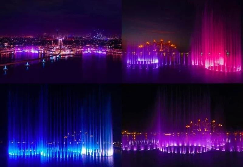 Spread over 14,000 sq ft of seawater, the fountain's super shooter will stand tall at 105m and come alive with over 3,000 LED lights. It is the only multicoloured fountain in Dubai.