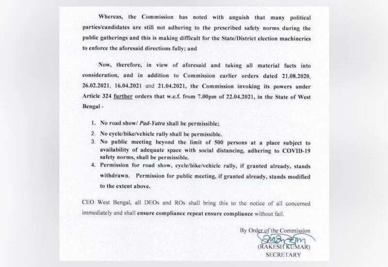 " ... the commission invoking its powers under Article 324 further orders that with effect from7 pm of April 22, in the state of West Bengal no roadshow/padyatra shall be permissible; No cycle/bike/vehicle rally shall be permissible; No public meeting beyond the limit of 500 persons at a place subject to availability of adequate space with social distancing, adhering to COVID-19 safety norms, shall be permissible," the order said.