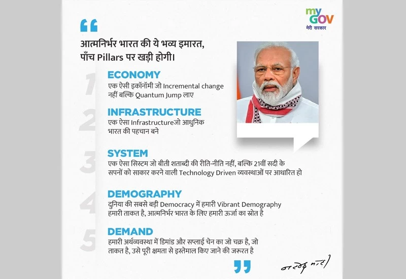 New Delhi: Addressing the nation today, Prime Minister Narendra Modi said that building a Self Reliant India was essential in a post COVID-19 world. He highlighted that India's self reliance would be based on 5 pillars - Economy, Infrastructure, System, Demography and Demand.