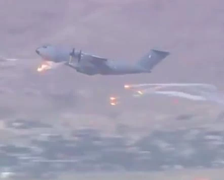 A French cargo jet was recorded dropping a slew of flares meant to fool heat-seeking equipment used in missiles.
