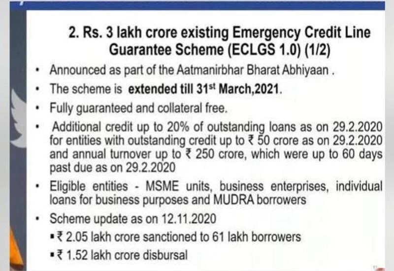 Announced as part of the Atma Nirbhar Baharat package in May to support micro, small and medium enterprises, the scheme provided fully guaranteed and collateral-free loans for amounts up to 20% of outstanding loans as of February 29.
