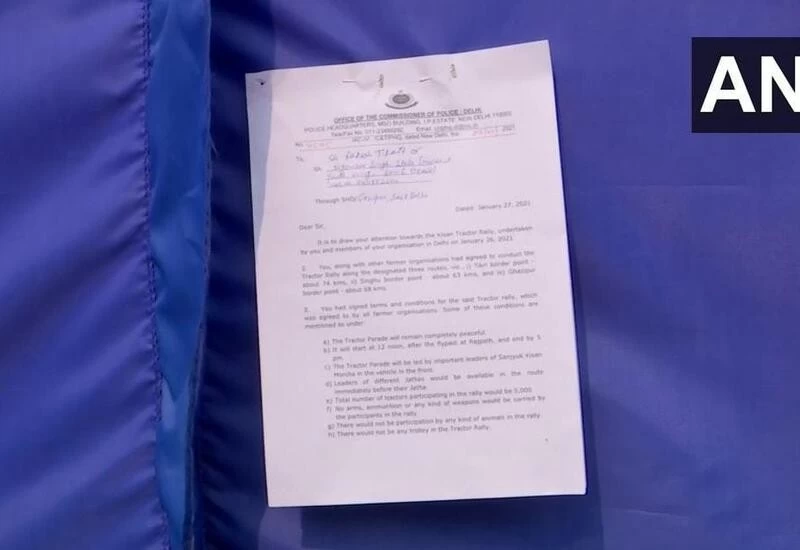Delhi Police has issued notices to at least 20 farmer leaders on Thursday for breaching the agreement with police regarding the farmers' tractor rally on Republic Day. The notice was served by the police to farmer leaders including Yogendra Yadav, Baldev Singh Sirsa and Balbir S Rajewal and asked them to give a reply within three days, informed Delhi Police.