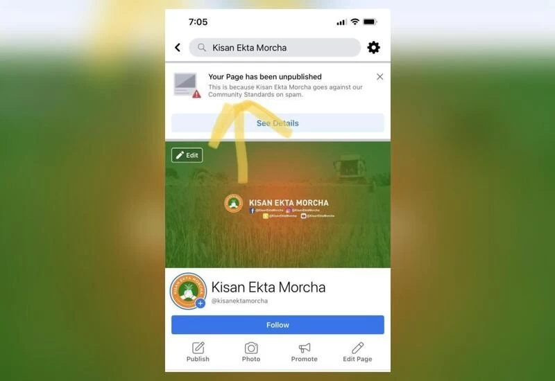 “This is because Kisan Ekta Morcha goes against the Community Standards on spam,” the screenshot mentioned.