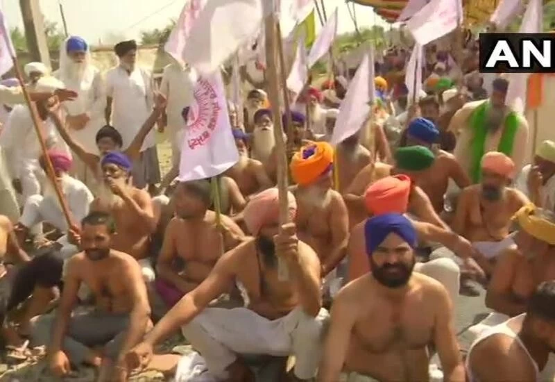 Sitting on the rail track, the bare-chested protesters shouted slogans against the BJP-led central government and demanded that the farm bills be withdrawn.