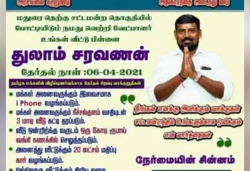 Saravanan is an independent candidate contesting from the Madurai South constituency. The promises he made on his manifesto have grabbed the attention of the constituency.