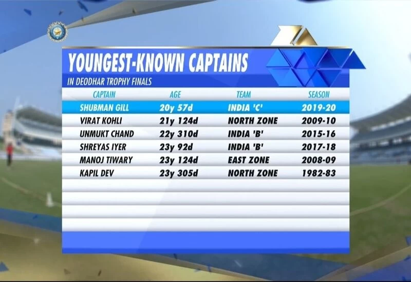 Shubman Gill became the youngest-known captain to lead a side in the Deodhar Trophy final. The Punjab right-hander broke India captain Virat Kohli’s 10-year-old record. Kohli had led North Zone in the Deodhar Trophy final when he was 21 years and 124 days old in 2009-10. Gill is only 20 years and 57 days old.