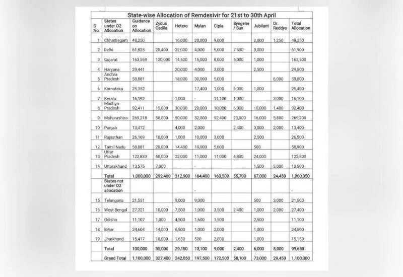The allocation includes bulk purchases made by the states as well as supplies through private distribution channels. Several states and UTs have reported acute shortage of Remdesivir and raised the issue with the Centre.