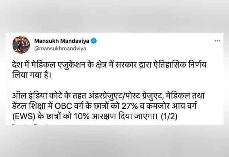 "The present government is committed to providing due reservation both to the backward category as well as the EWS category. The Union government has now taken a historic decision to provide for 27% reservation for OBCs and 10% reservation for EWS in the AIQ Scheme. The OBC students from across the country shall now be able to take benefit of this reservation in AIQ Scheme to compete for seats in any State. Being a Central Scheme, the Central List of OBCs shall be used for this reservation.," the government said.
