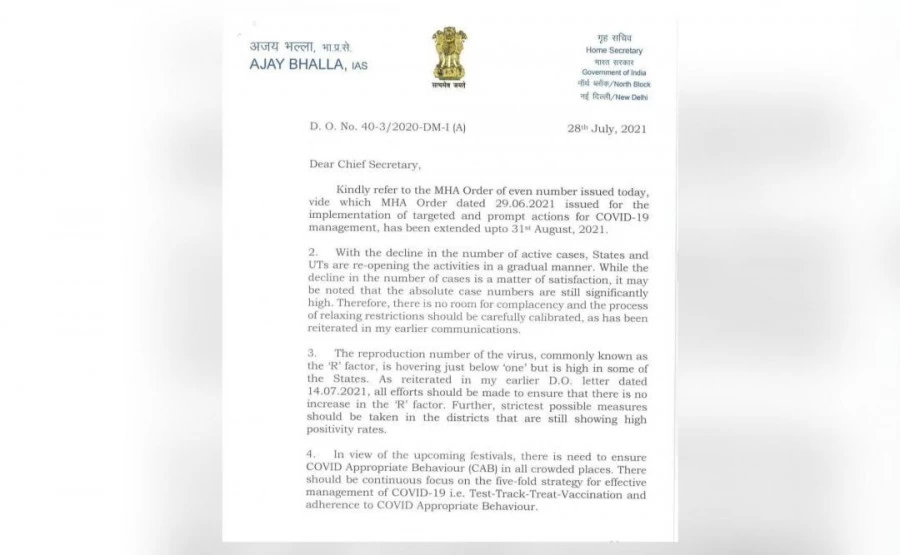 “The reproduction number of the virus, commonly known as the 'R' factor, is hovering just below 'one' but is high in some of the states. As reiterated in my earlier D.O. letter dated 14.07.2021, all efforts should be made to ensure that there is no increase in the 'R' factor. Further, strictest possible measures should be taken in the districts that are still showing high positivity rates,” Bhalla wrote to all state chief secretaries and UT administrators.