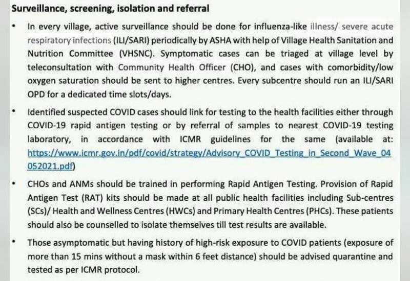 Identified suspected COVID cases should link for testing to health facilities either through COVID-19 rapid antigen testing or by referral of samples to nearest COVID-19 testing laboratory, in accordance with ICMR guidelines.