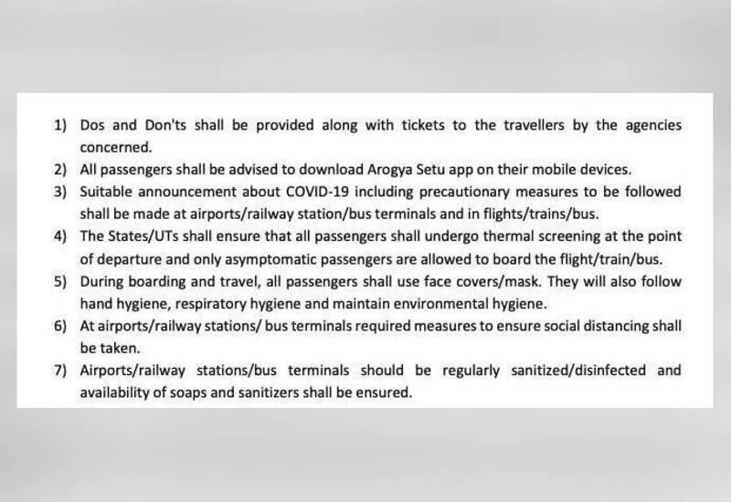 The guidelines stated that the passengers are required to follow social distancing at all times and wear protective masks. Aarogya Setu mobile app should be installed by all passengers. Asymptomatic passengers will be allowed to go home and observe their health for 14 days and report in case any symptoms arise.