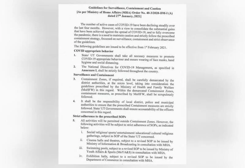 The government also allowed the opening of swimming pools and exhibitions. However, on the issue of religious and political gatherings, the Centre has left the decision on the states concerned. The guidelines will be effective from February 1 to February 28.