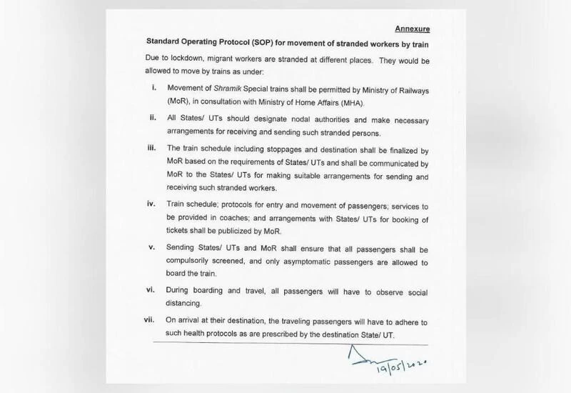 New Delhi: The Ministry of Home Ministry on Tuesday issued a revised Standard Operating Protocol (SOP) on the movement of stranded workers by trains and buses from one state to other during coronavirus lockdown.